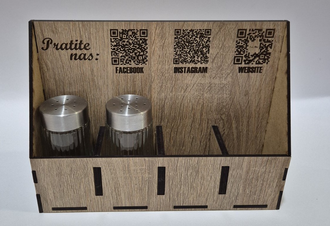 Profesionalno izrađen drveni salvetnik namenjen ugostiteljskim objektima koji žele uredan, estetski usklađen i brendiran sto. Precizna CO2 laserska gravura omogućava jasno i dugotrajno isticanje naziva lokala, logotipa ili posebne poruke.