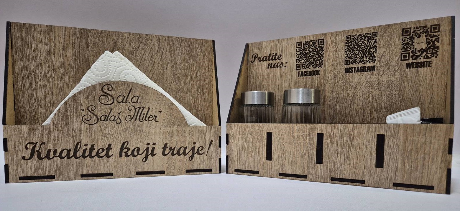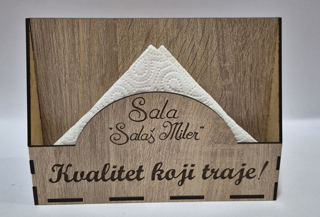Profesionalno izrađen drveni salvetnik namenjen ugostiteljskim objektima koji žele uredan, estetski usklađen i brendiran sto. Precizna CO2 laserska gravura omogućava jasno i dugotrajno isticanje naziva lokala, logotipa ili posebne poruke.